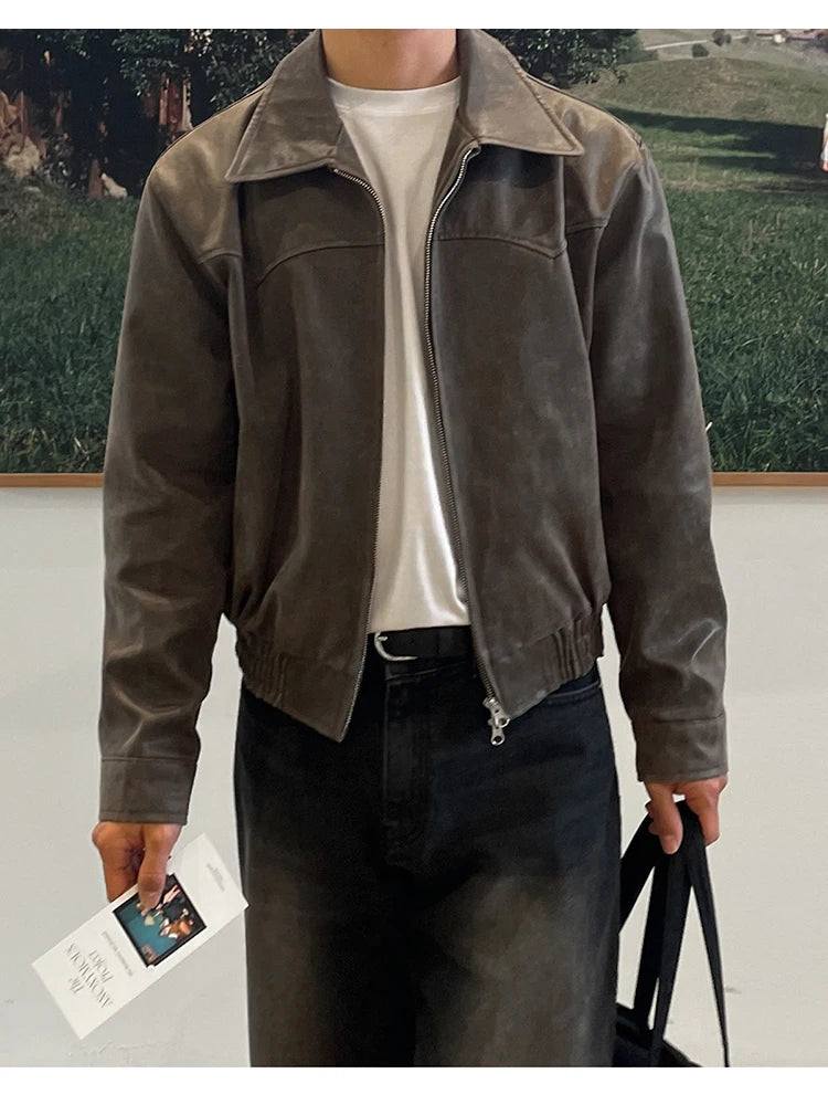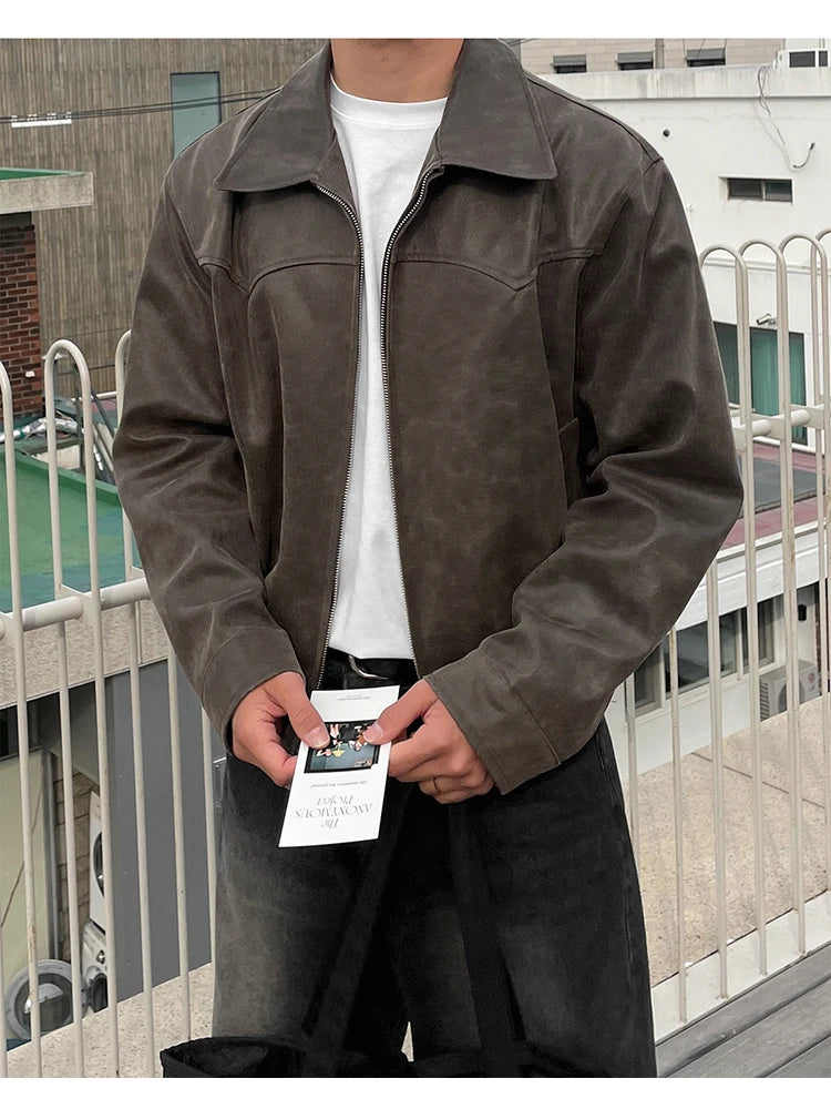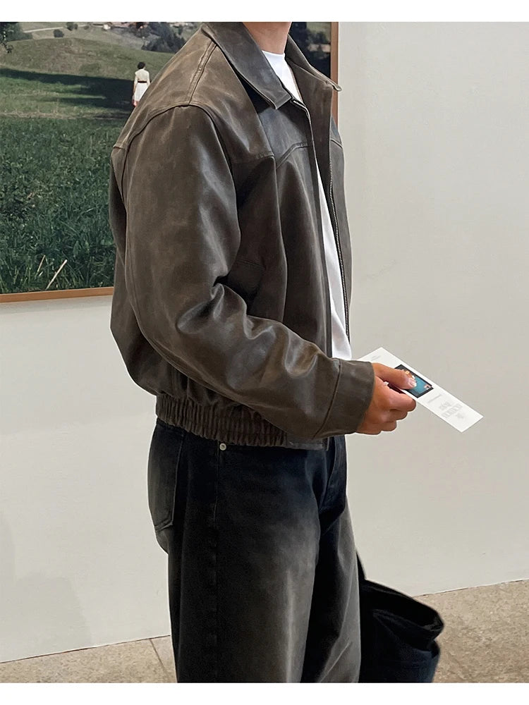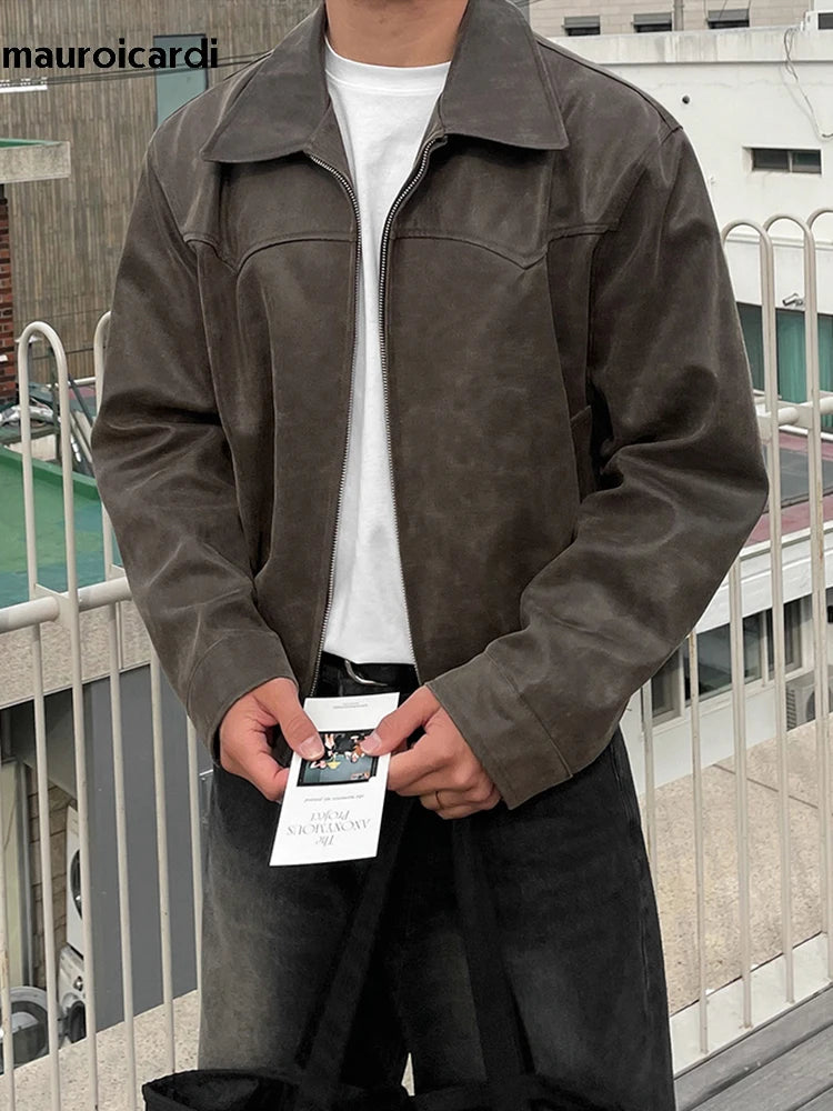 Mauroicardi Spring Autumn Vintage Lightweight Distressed Washed Brown Pu Leather Jacket Men Zipper Casual Korean Fashion Clothes